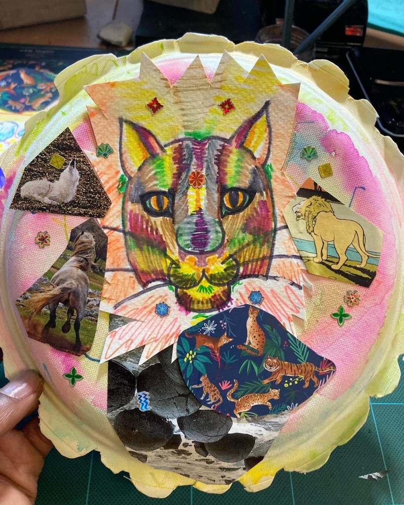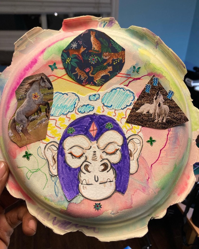 B🐝 and IMy holiday rumnogg bevy My mural painting travel ‘fitIf you zoom in you can see the Queen in the backseat My beautiful babe!And her fine ass😈Our amazing gingerbread 🏠 We didn’t read the instructions which told us to build the house in this little plastic tray to help it stand. Instead we used elastic bands lol #adhdcoupleMade these two cute collages with Scribble Me Silly and some cool kids on zoom. This piece was inspired by Mojo Jojo from Power Puff Girls so her name is Mija Yoyo This is the other piece I made which I call “Wild Tendencies”Holiday boooooyWe’ve been obsessed with COD mobile Battle Royale as of lately and really kicking ass at it too💪🏾